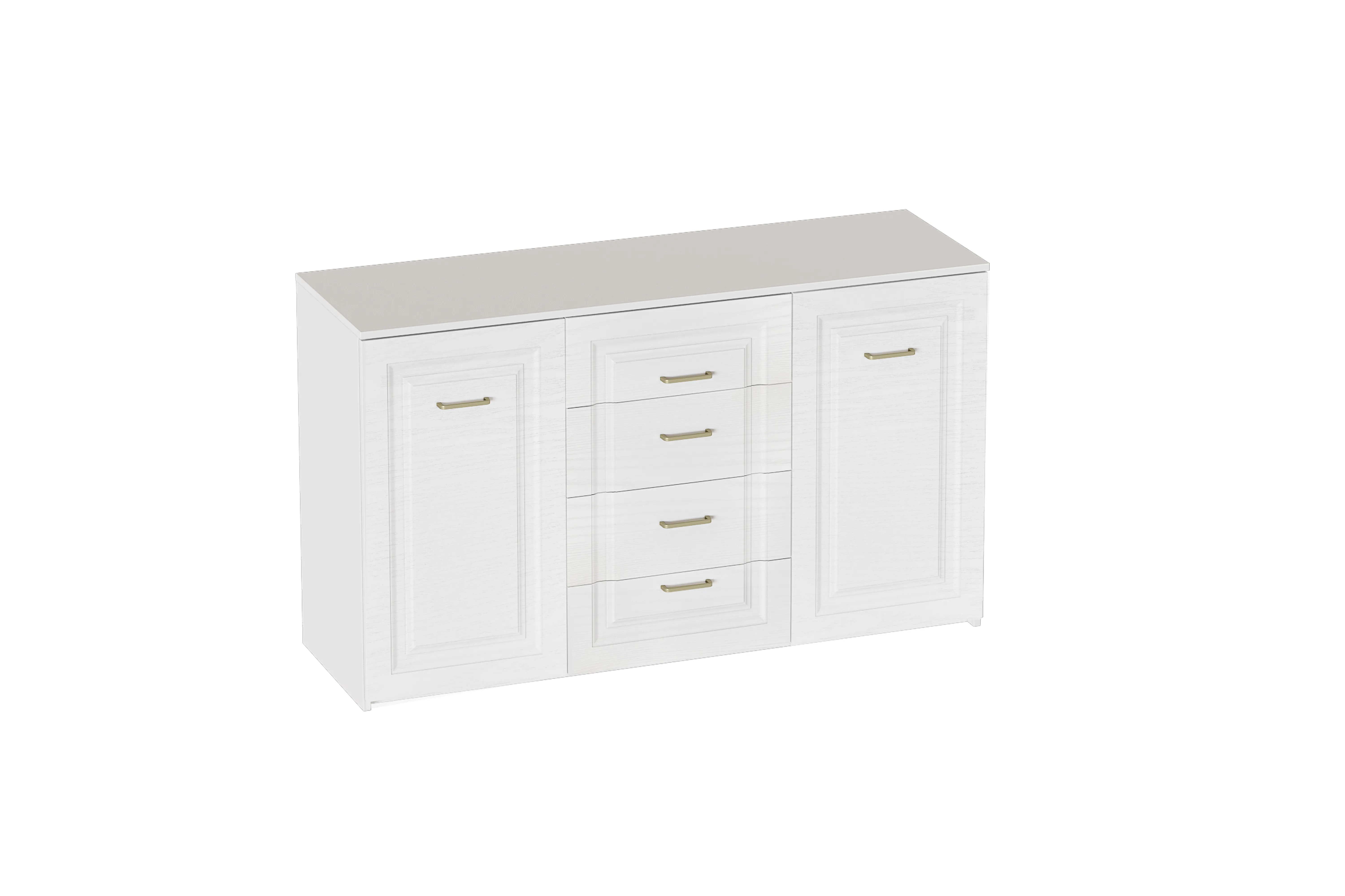 Комод выполнен в цвете Айс 06 / Белый Аляска. Классическая фрезеровка фасадов и ручки-скобы из брашированного золота придают изделию особый шарм и элегантность. Комод с полупроходными боками, прямоугольной крышкой и дном. Внутри пространство разделено на три секции. В средней секции расположены 4 ящика на шариковых направляющих без доводчика, крайние секции закрыты распашными дверями на петлях с доводчиком, за которыми расположены съемные полки. Дно и задние стенки выполнены из ХДФ. На опорах размещены войлочные подпятники.