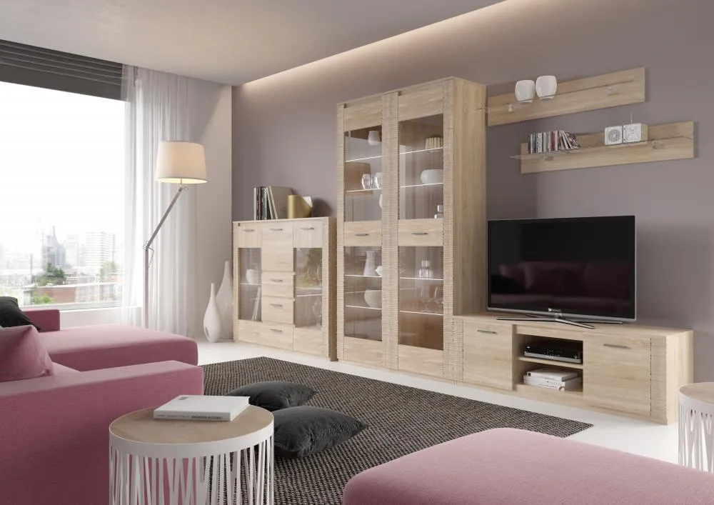 По центру комода располагаются три ящика на роликовых направляющих, над которыми имеется отделение бара закрытое глухой дверцей. Боковые отделения закрыты распашными дверцами со стеклом. Каждое из отделений оснащено двумя стационарными полками и съёмной стеклянной полкой, на которую можно установить светильник.