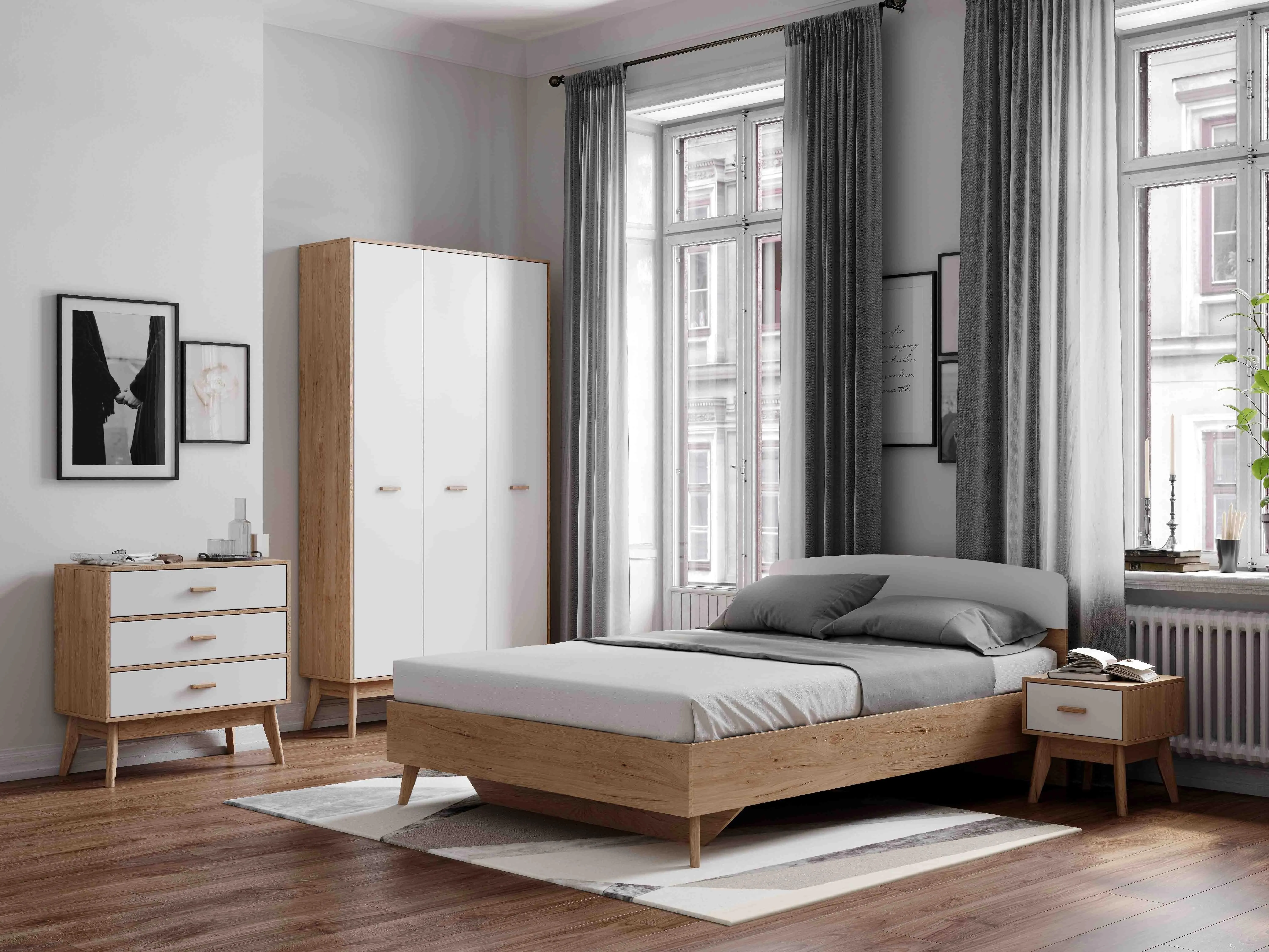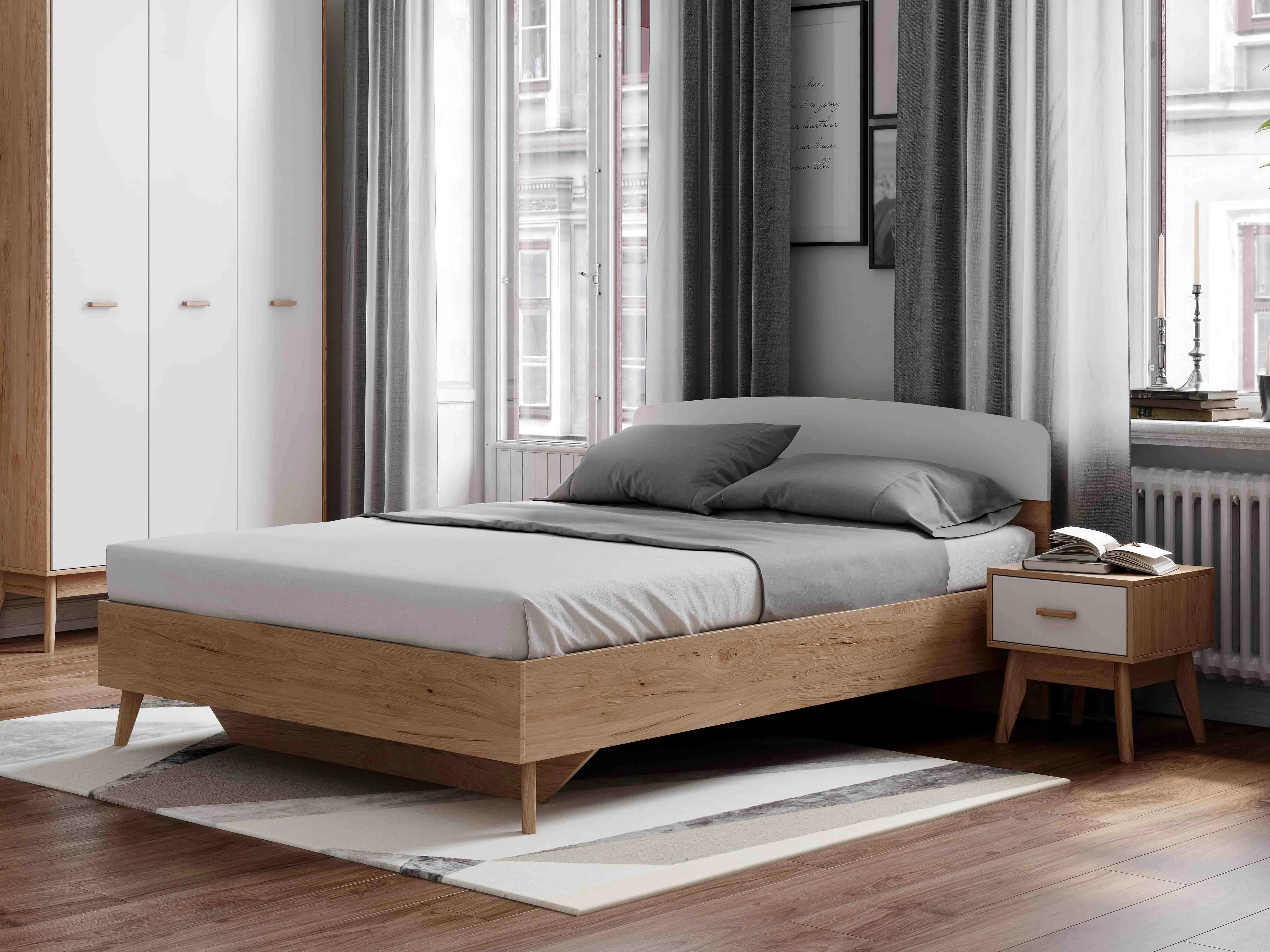 <virtues>Кровать выбрали из-за небольшой длины, всего 205,5 см и в дополнение к спальному гарнитуру Калгари. Кровать смотрится легко, совсем не загромождает пространство. Высокие ножки позволяют расположить под кроватью красивые коробки с разными мелочами. Кровать хорошо смотрится в скандинавском интерьере.</virtues> <limitations>Не обнаружено</limitations>