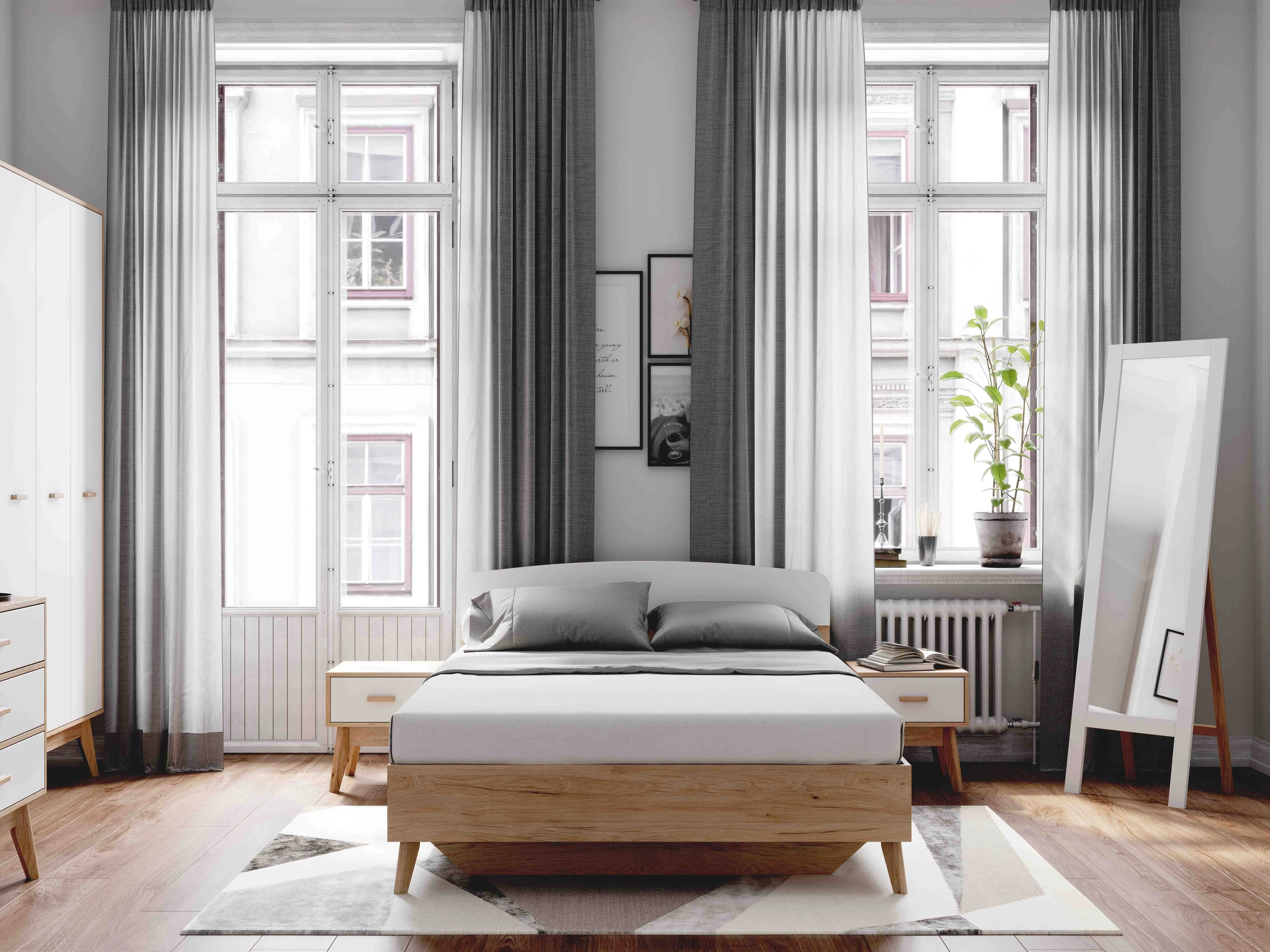 Корпус изготовлен из ЛДСП толщиной 16 мм в цвет натурального дуба, белая накладка в изголовье - из МДФ толщиной 16 мм. Опоры сделаны из натурального массива березы. Высота опор 25 см. Высота спального места 38 см. Рекомендуемая высота матраса 16-25 см. В комплект кровати входит прочное ортопедическое основание на березовых ламелях. Максимальная нагрузка на одно спальное место составляет 150 кг.