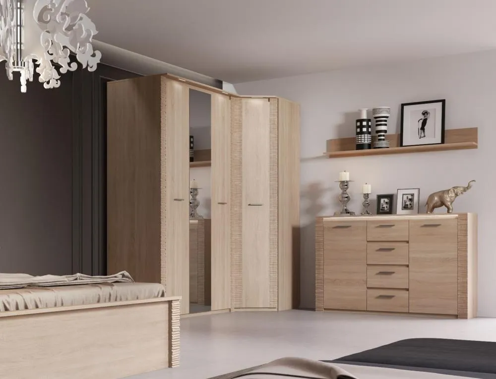 Серия мебели для спальни с нежным названием "Элана" такая же мягкая и романтичная. В ней воплощены самые актуальные тенденции мебельной индустрии, основой которых сегодня является акцент на мягкие, природные, естественные линии. Все это отражается в деталях коллекции: фрезерованные планки, подсветка, мягкие элементы кровати, - делают эту спальню изысканной и необыкновенной.