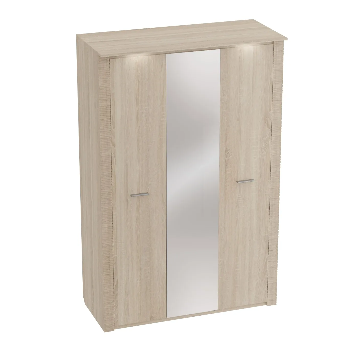 Трехдверный шкаф с зеркалом "Элана" оснащен двумя отделениями: для белья с четырьмя съёмными и центральной жёсткой полкой; платяное с жесткой полкой и продольной стальной штангой. В колпаке шкафа имеются пазы для двух светильников, входящих в комплект. Блок питания приобретается отдельно, и рассчитан на подключение шести светильников.