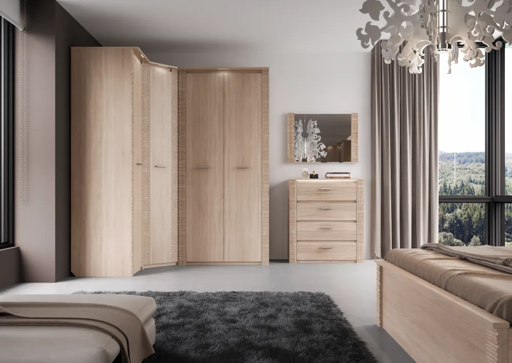 Угловой шкаф оснащен двумя отделениями: для белья с четырьмя жёсткими полками; платяное с жесткой полкой и продольной стальной штангой. В колпаке шкафа имеется паз для светильника, входящего в комплект. Блок питания приобретается отдельно, и рассчитан на подключение шести светильников.