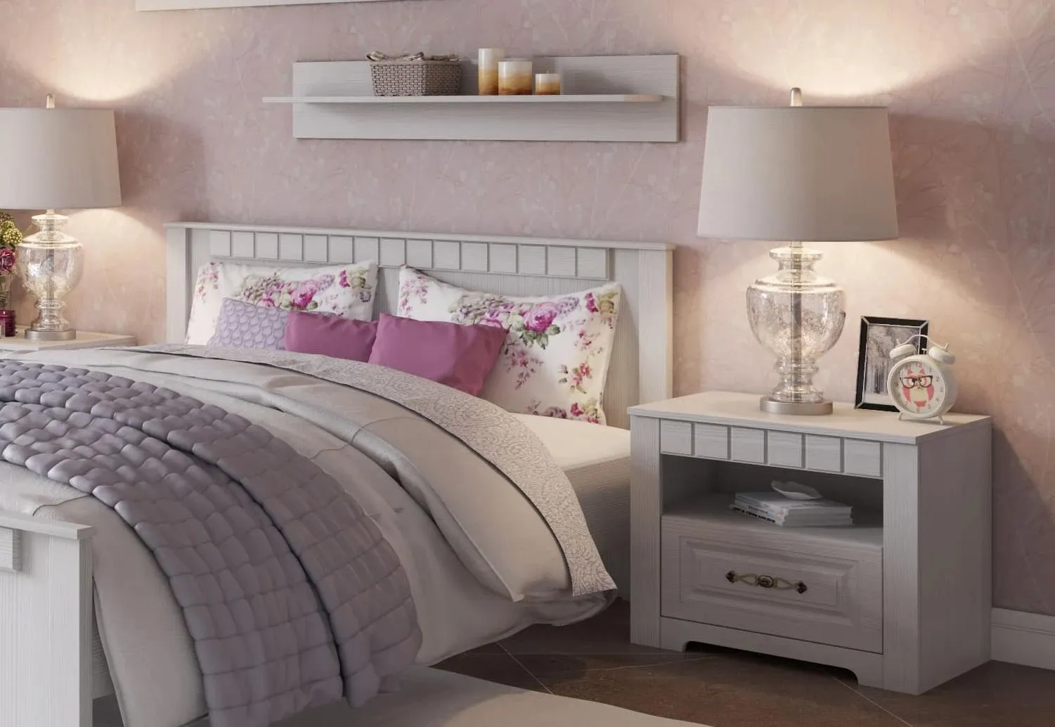 В серию "Прованс" входят: шкаф угловой, шкаф однодверный платяной, шкаф двухдверный, комод, антресоль двухдверная, антресоль угловая, антресоль однодверная, зеркало, стол туалетный, кровать, тумба прикроватная.