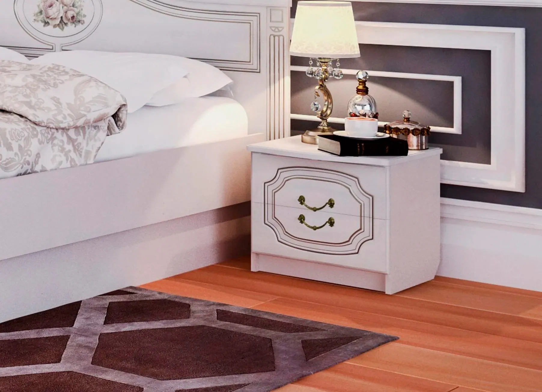 Фасады мебели декорированы элегантной фрезеровкой с эффектом патины и медальоном, на котором изображены розы. Для удобства использования ящики оснащены темными металлическими ручками, имитирующими ковку.