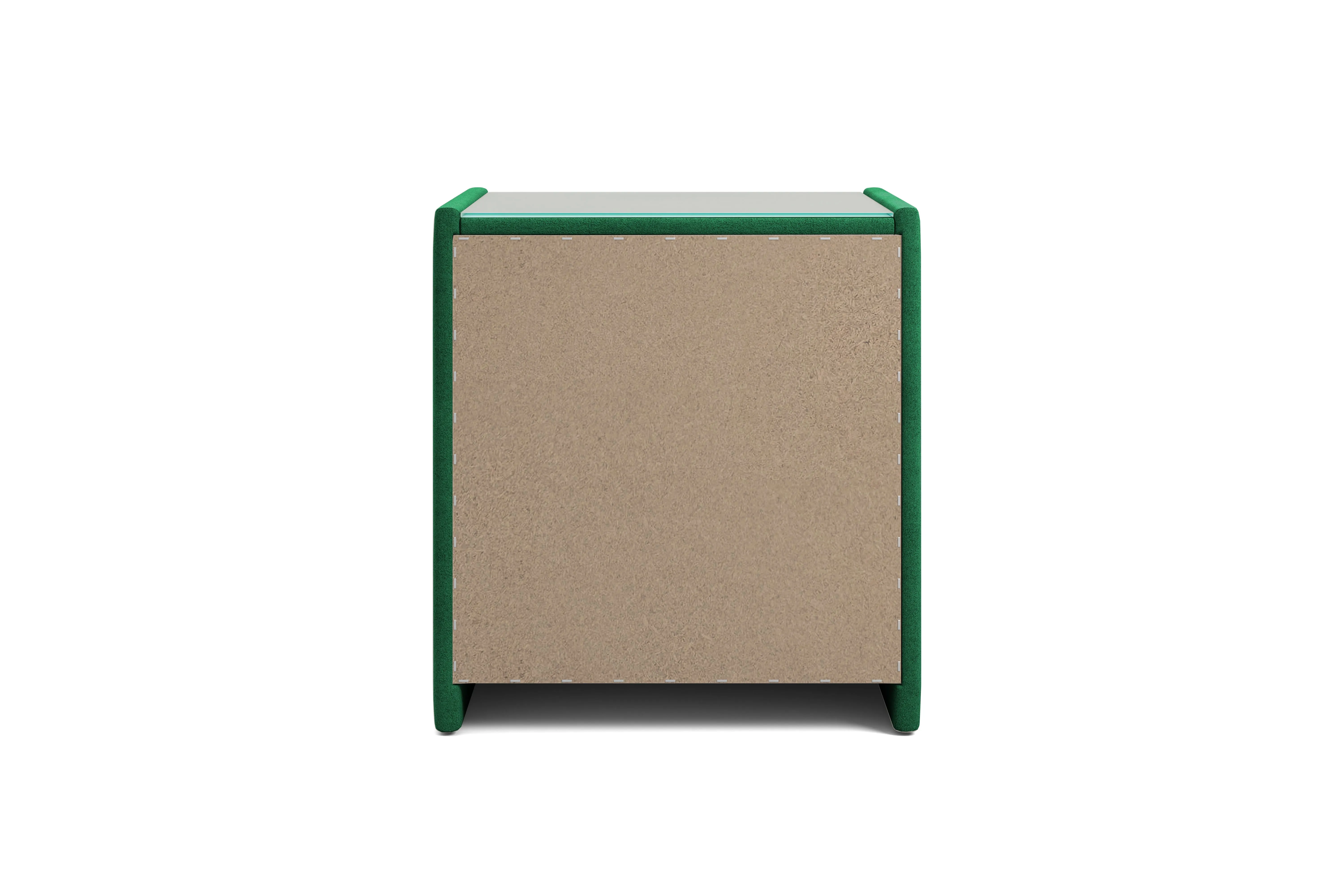 Тумба обтянута высококачественным велюром, что придает ей особый уют и комфорт. Имеет стеклянную столешницу и два вместительных выдвижных ящика с механизмом Push to open. Скругленные торцы модели, минимизируют риск удариться в темноте.