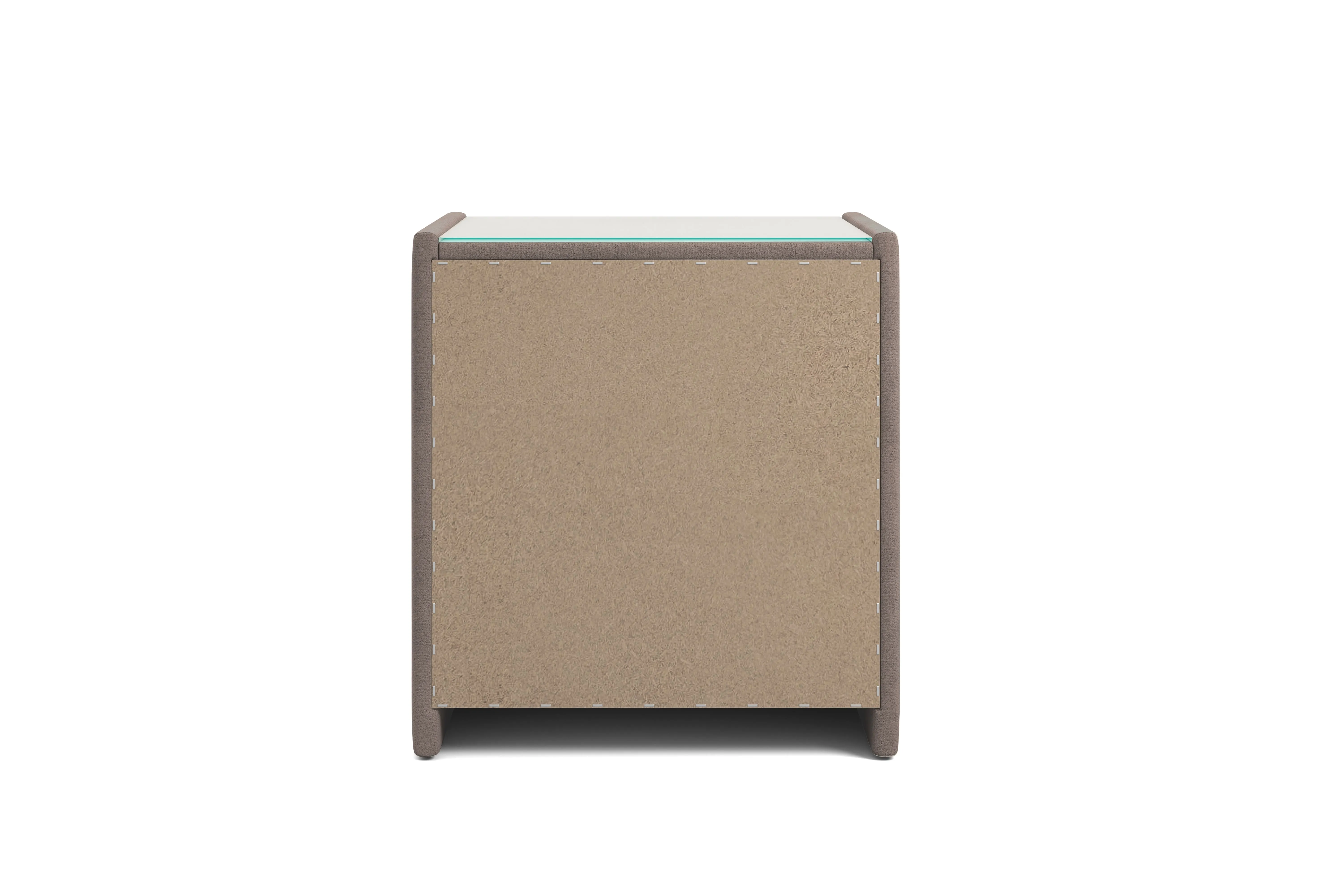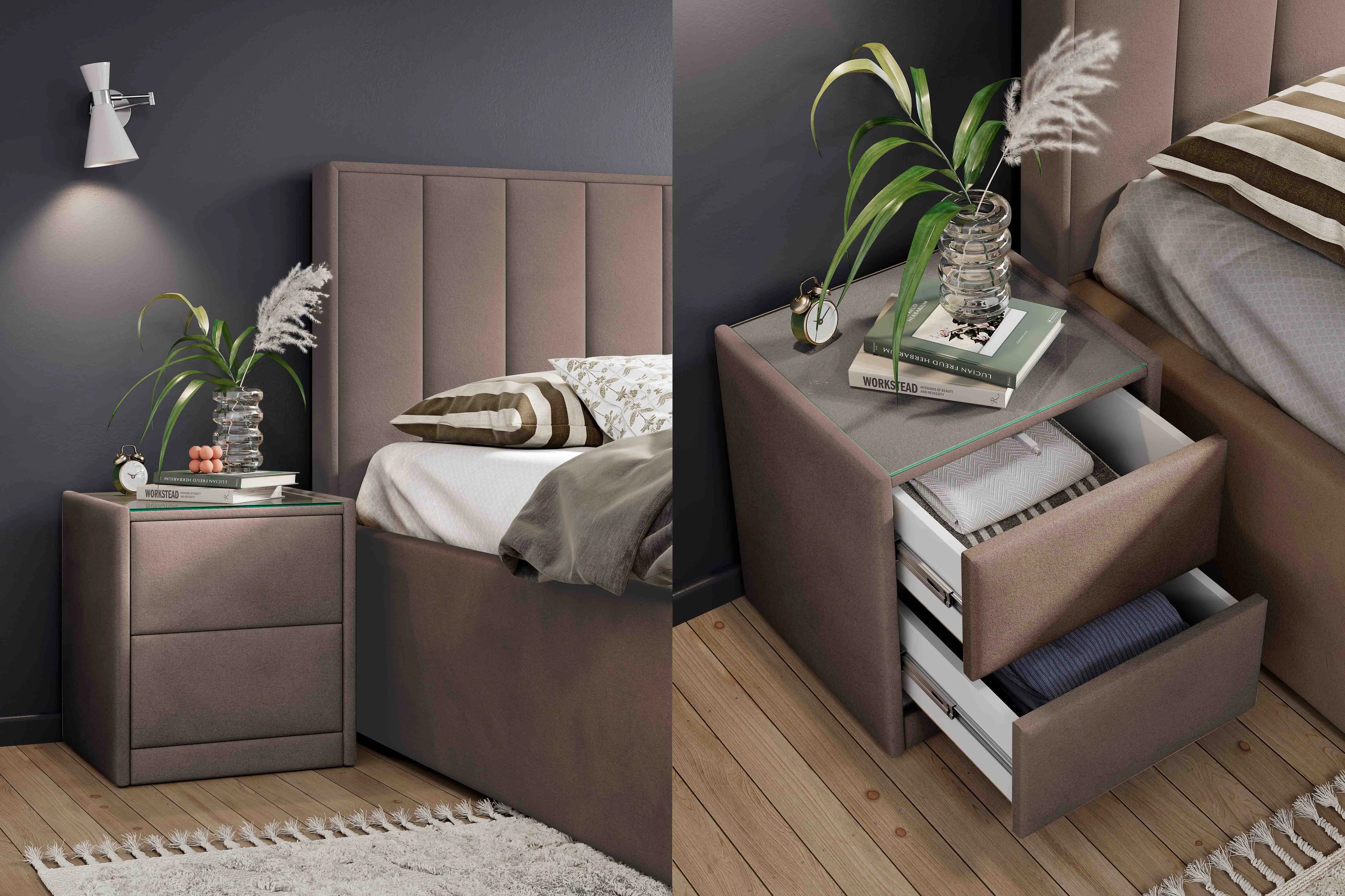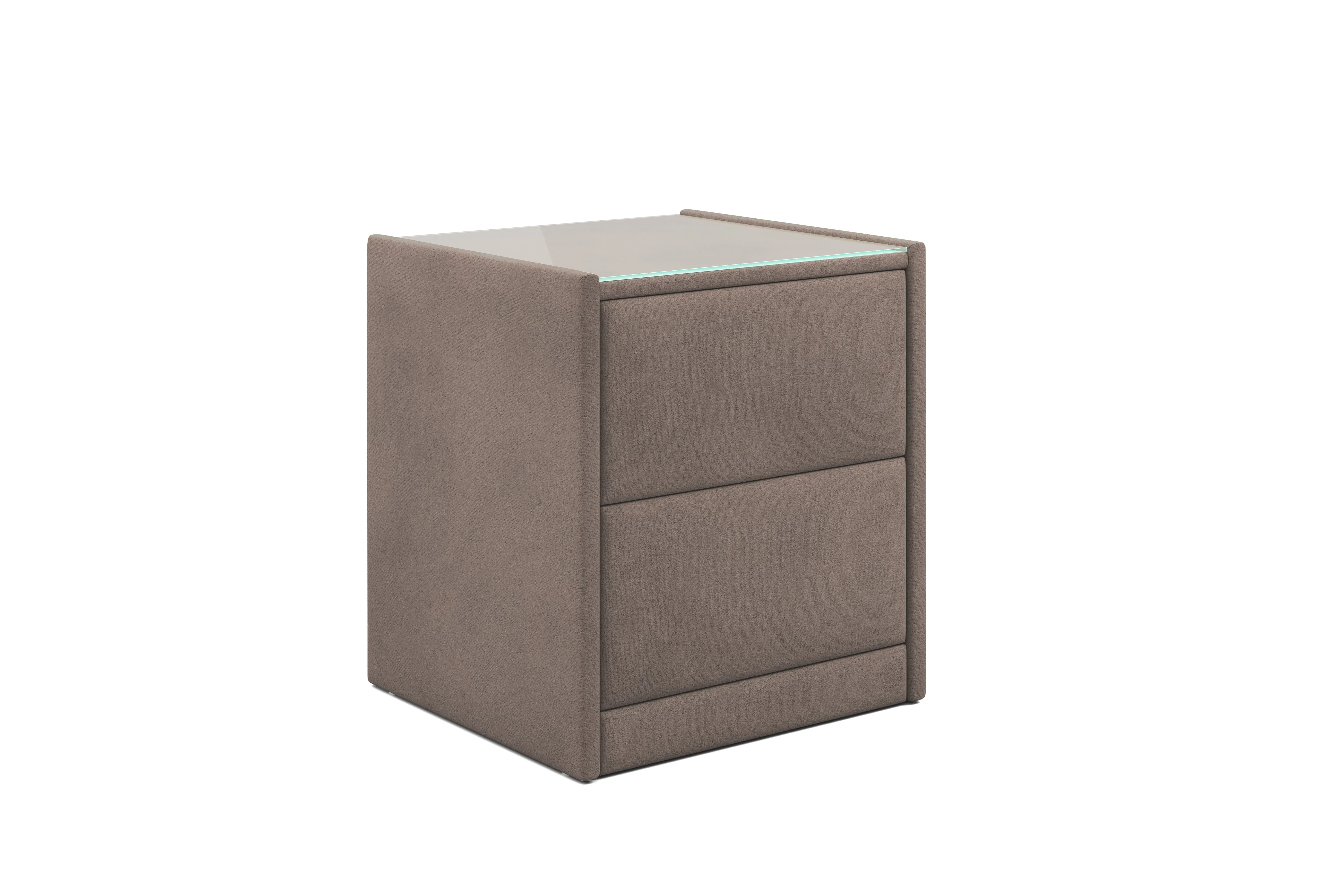 Тумба обтянута высококачественным велюром, что придает ей особый уют и комфорт. Имеет стеклянную столешницу и два вместительных выдвижных ящика с механизмом Push to open. Скругленные торцы модели, минимизируют риск удариться в темноте.
