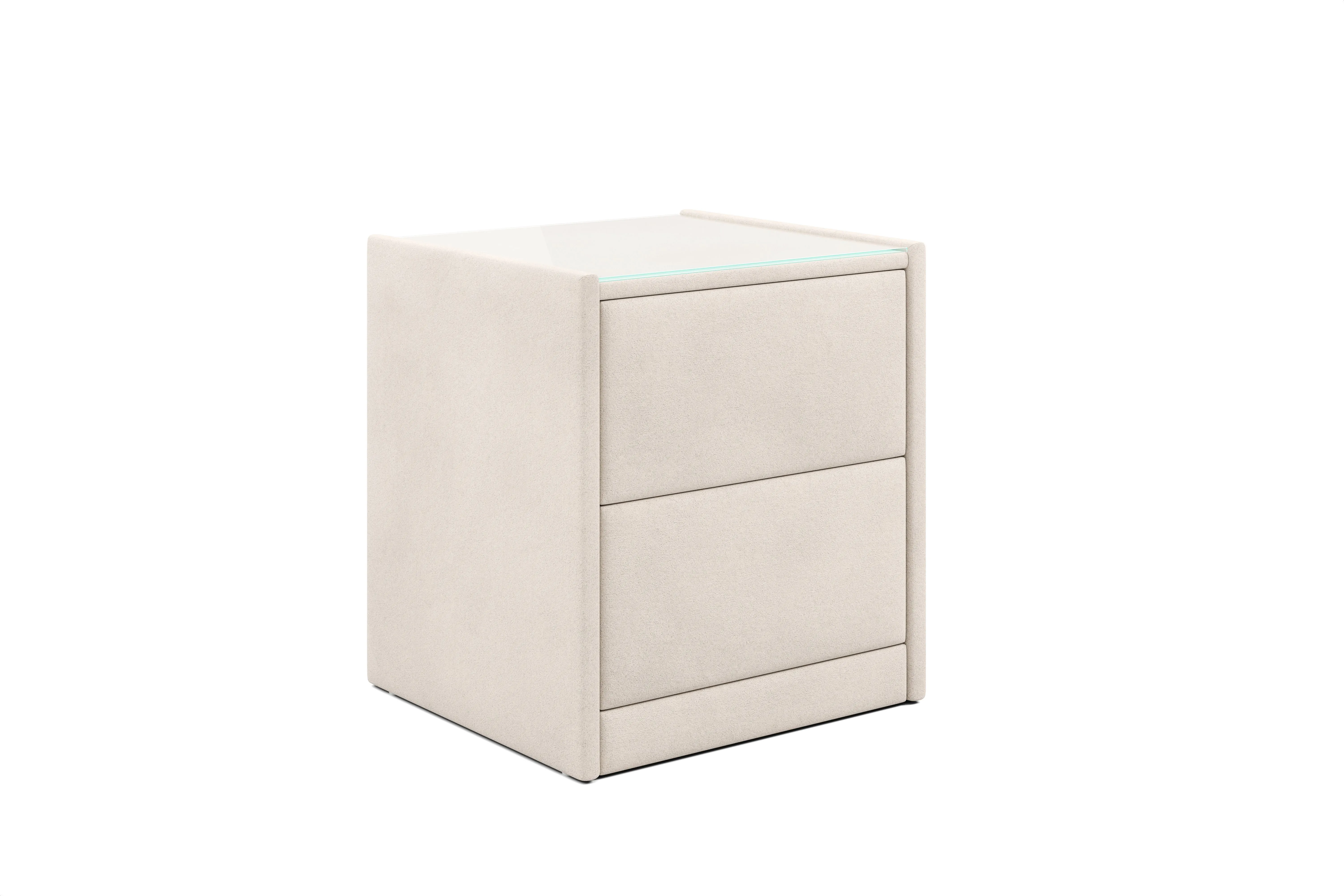 Тумба обтянута высококачественным велюром, что придает ей особый уют и комфорт. Имеет стеклянную столешницу и два вместительных выдвижных ящика с механизмом Push to open. Скругленные торцы модели, минимизируют риск удариться в темноте.