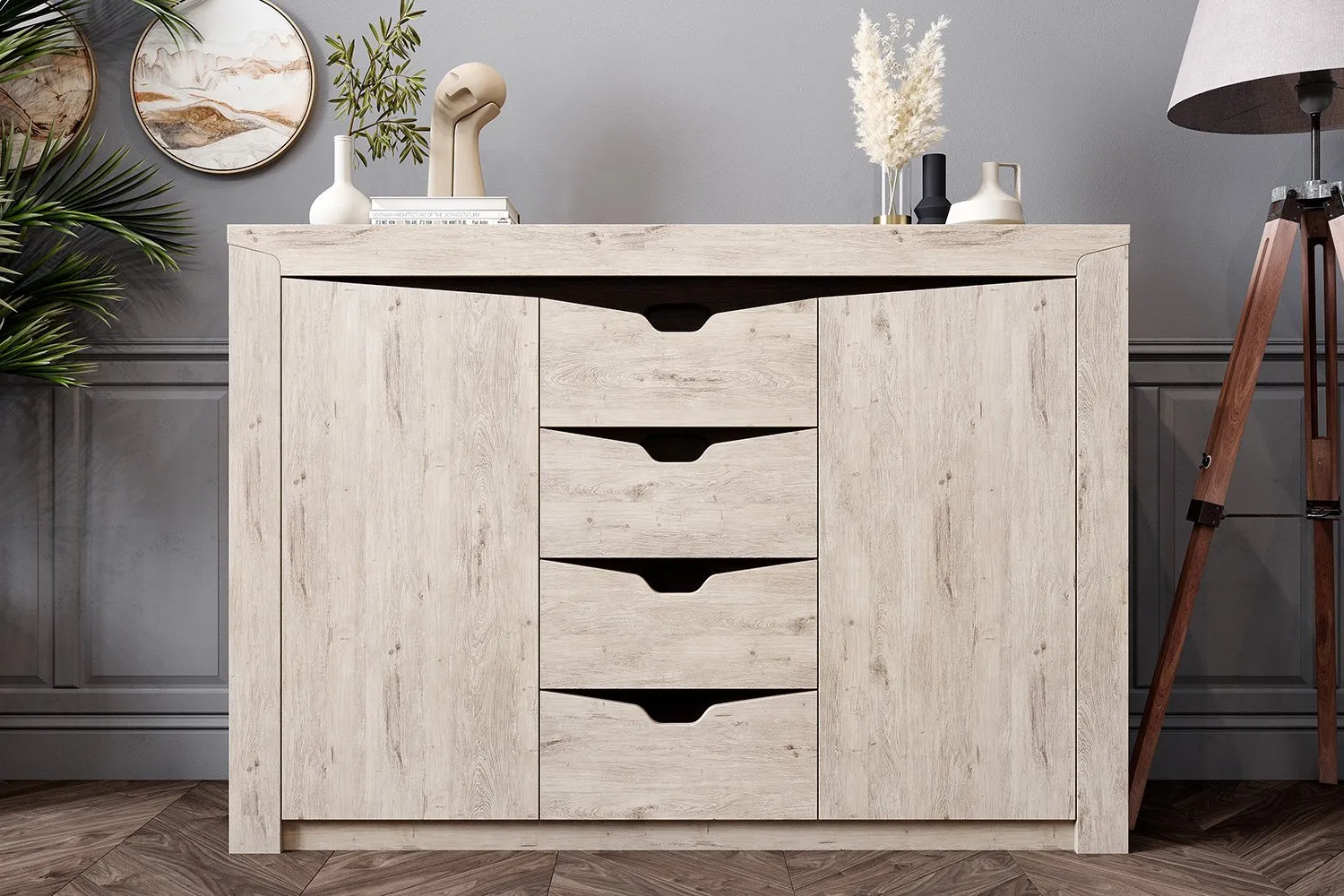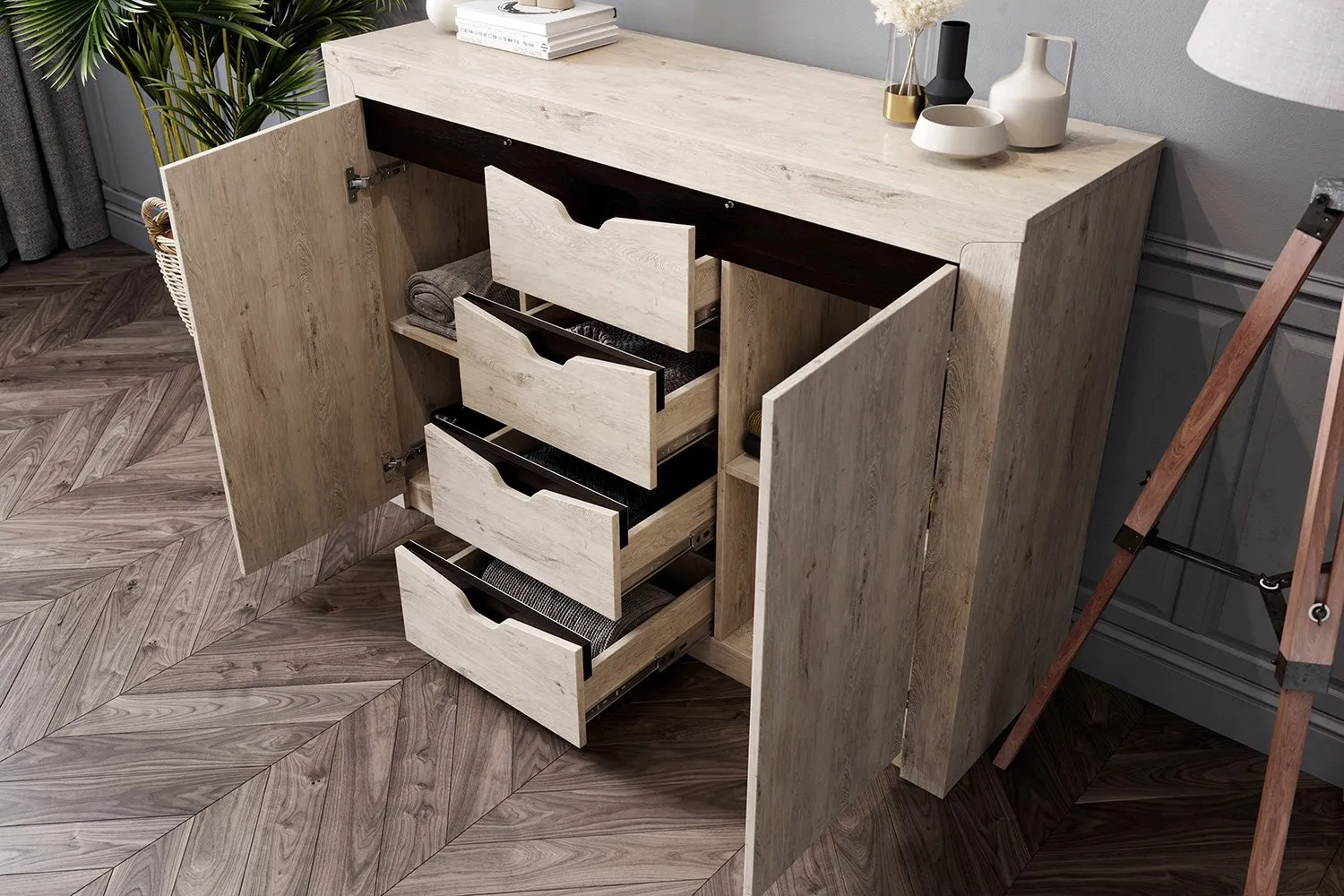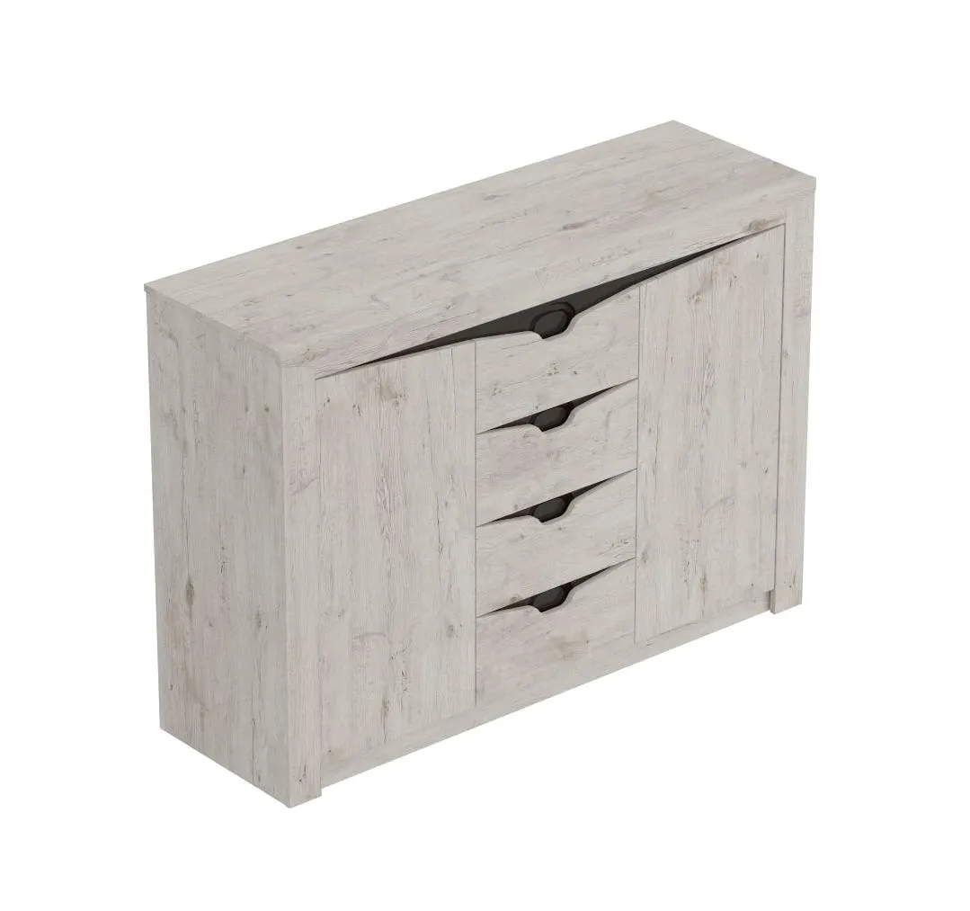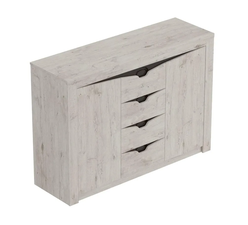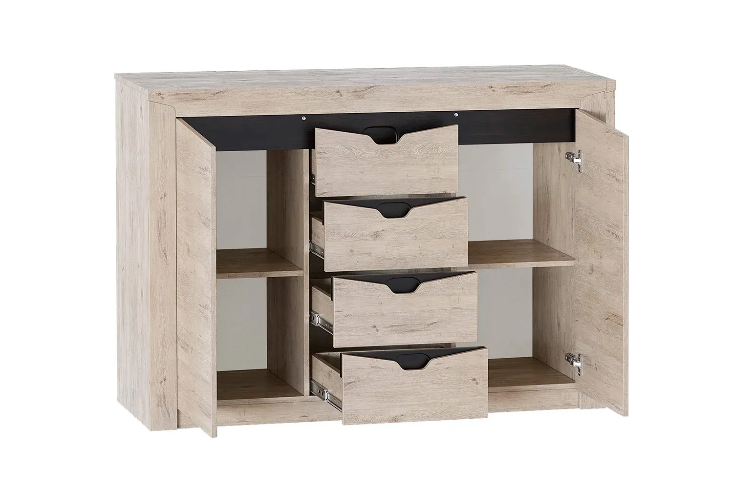 Тумба "Соренто" имеет четыре выдвижных ящика, а также два вместительных отделения по бокам с полками и распашными дверями. На фасаде имеются декоративные вырезы, выполняющие функцию ручек.
