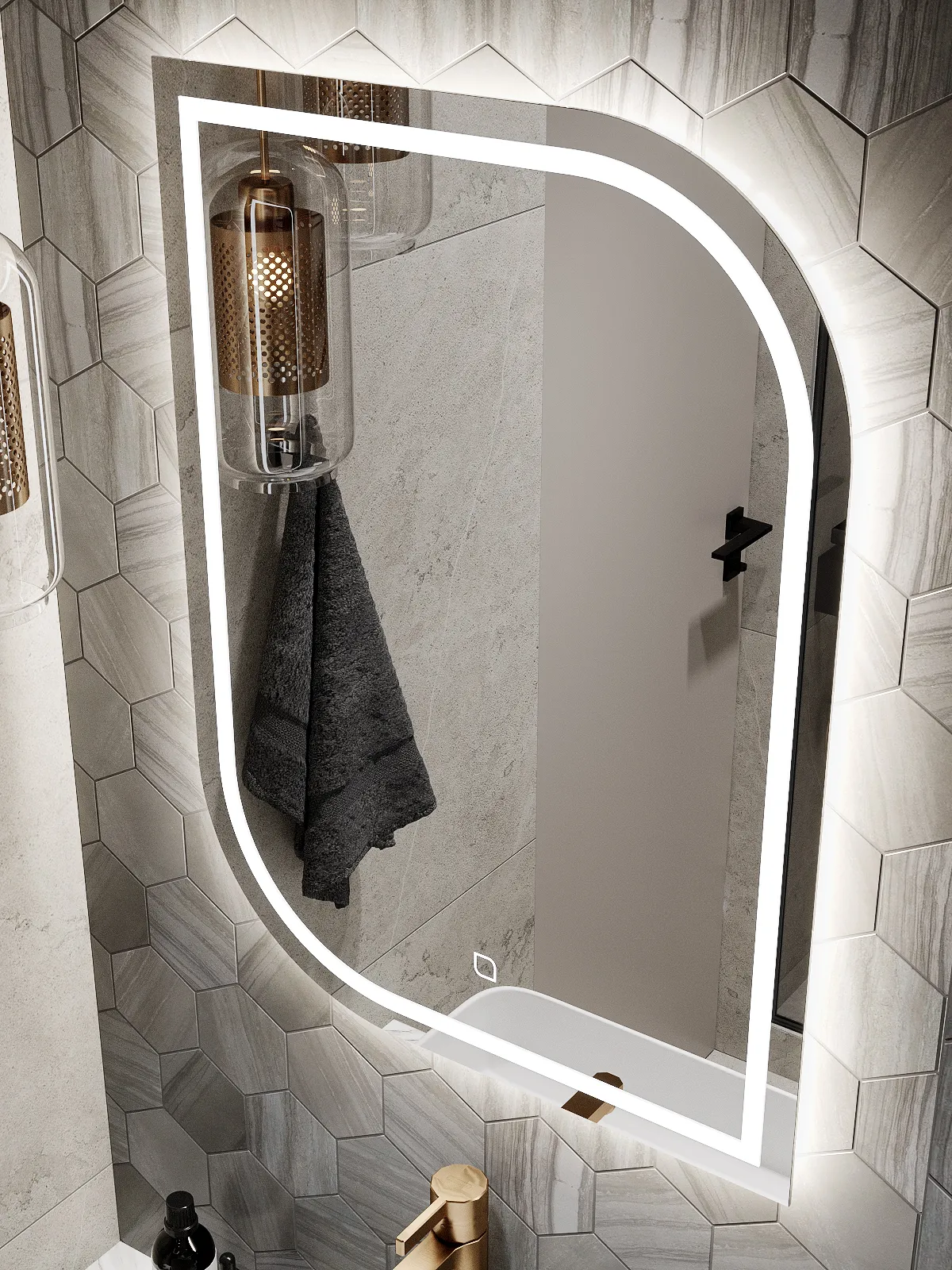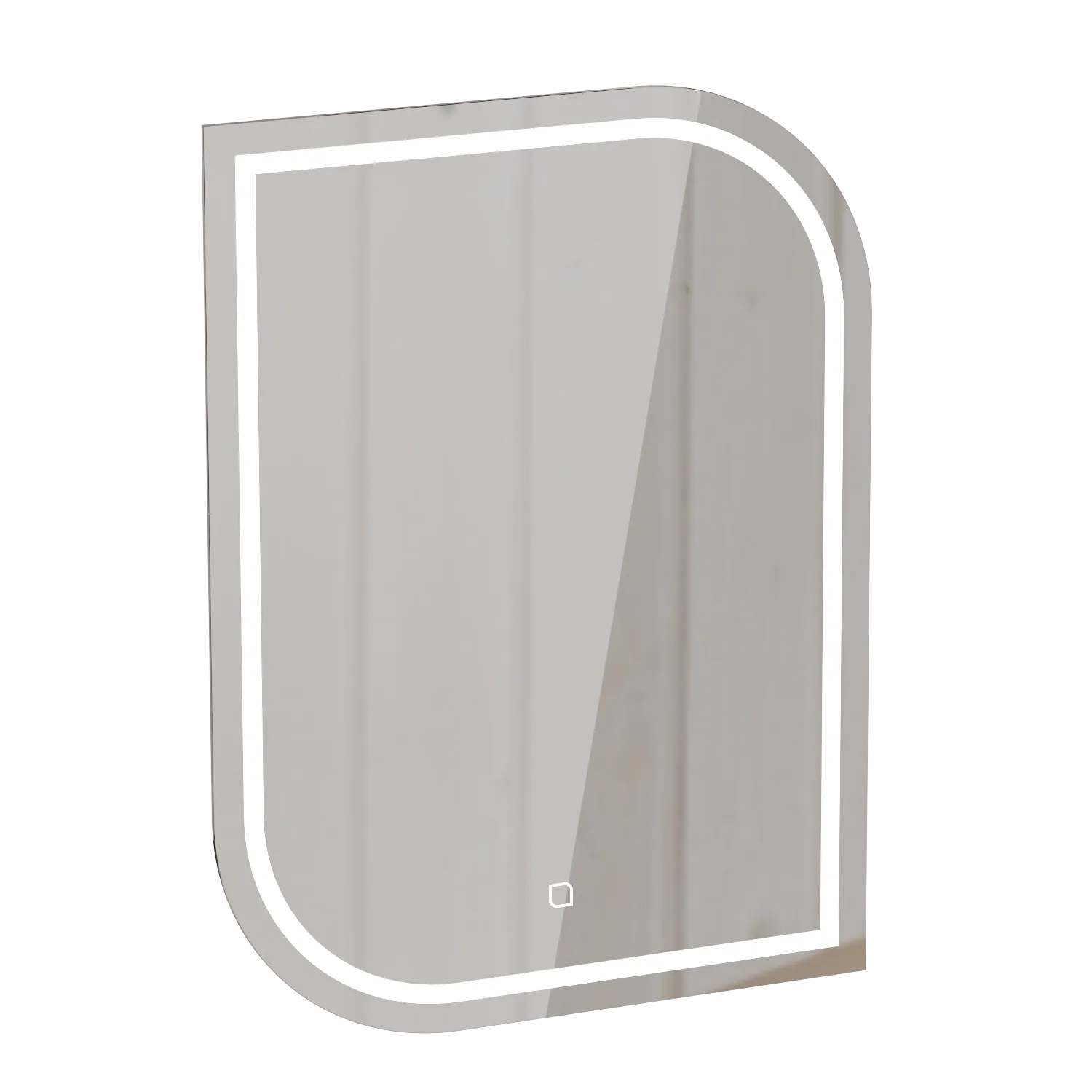Зеркало оснащено пластинами для крепления к стене и светодиодной лентой с выключателем, срабатывающим от прикосновения. Дюбель-гвоздь покупатель приобретает отдельно, исходя из материала стен.